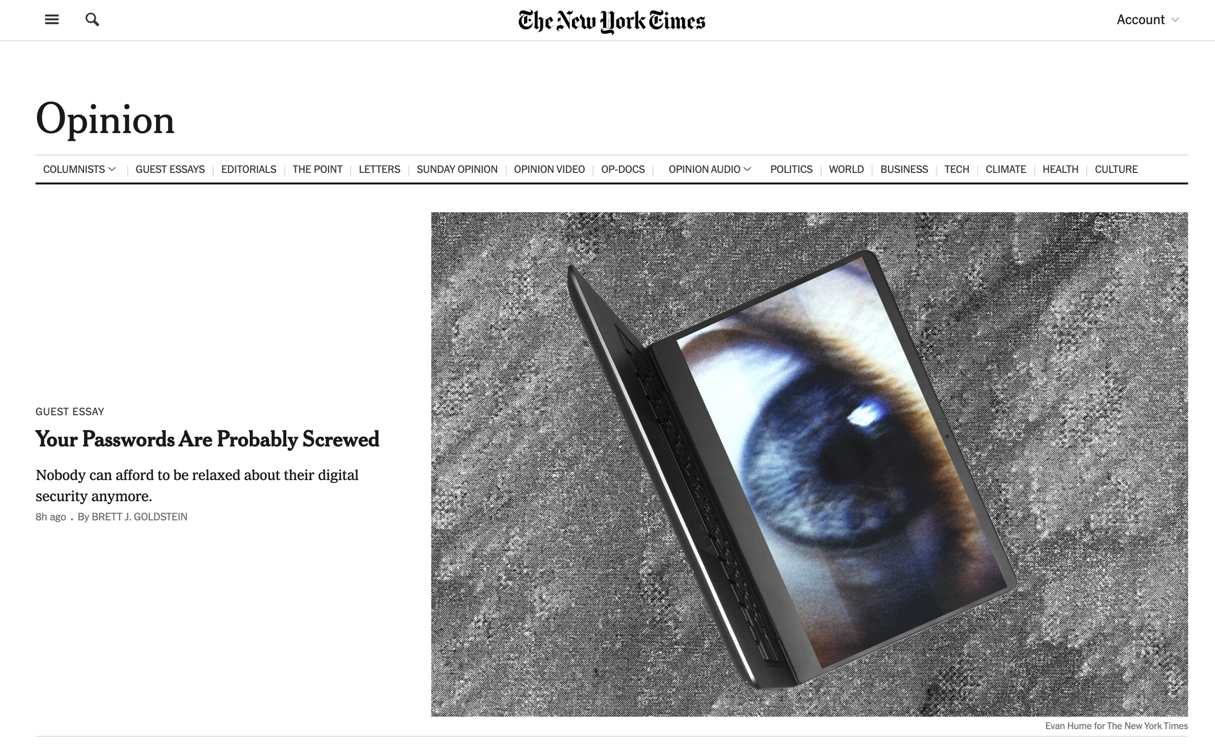 My latest photo illustration published for the NYT Opinion article, “Your Passwords Are Probably Screwed” by Brett J. Goldstein: